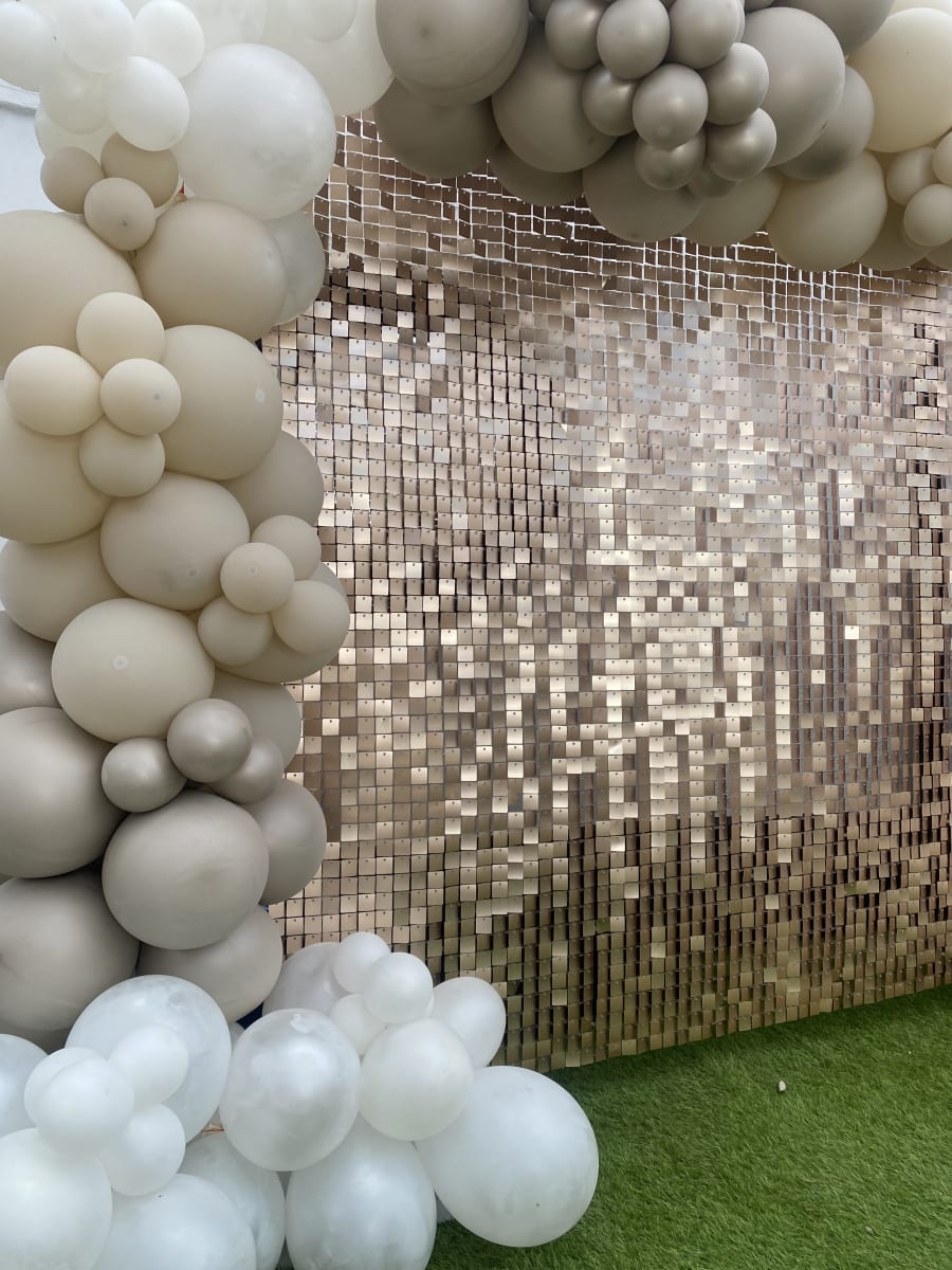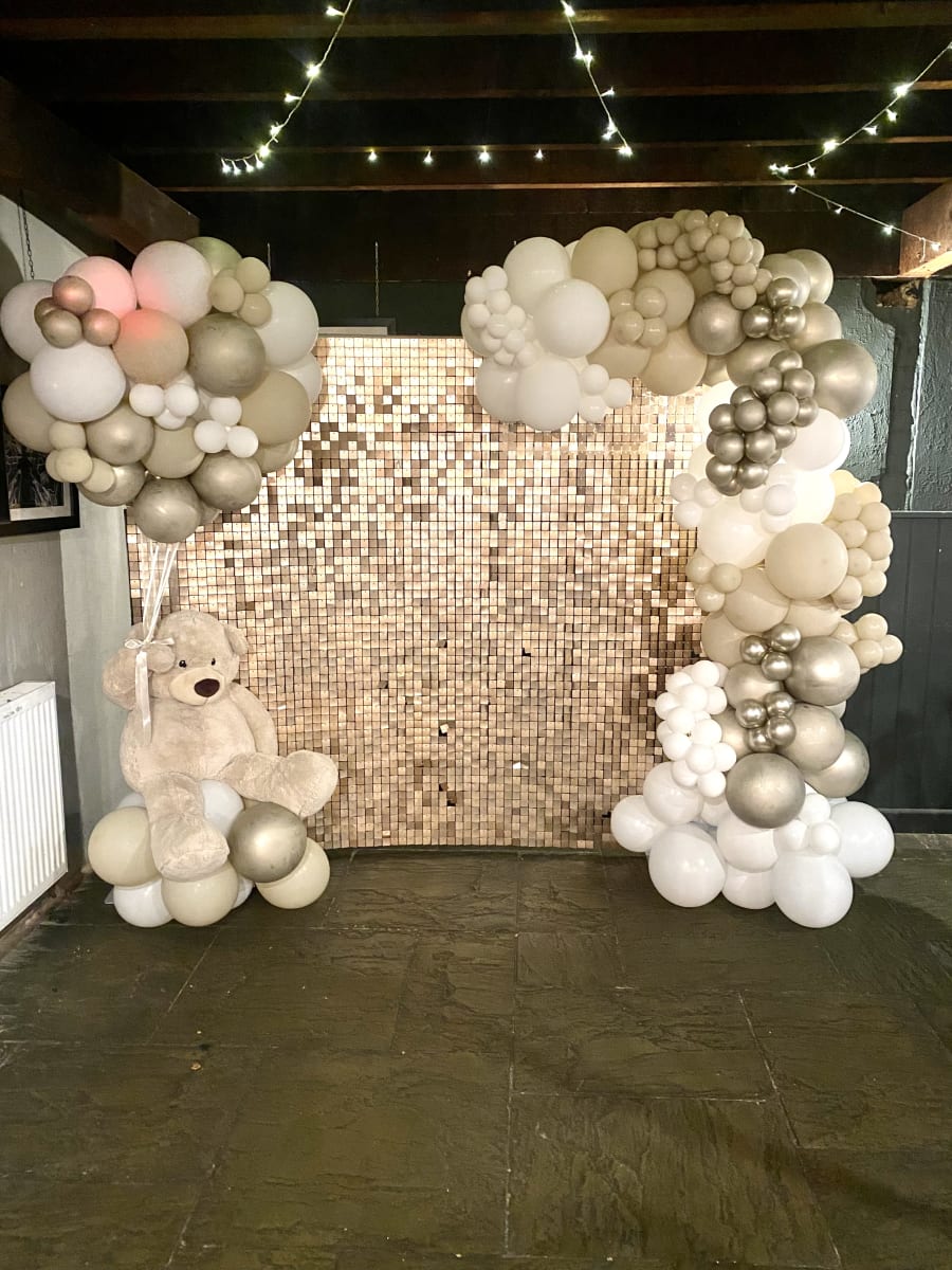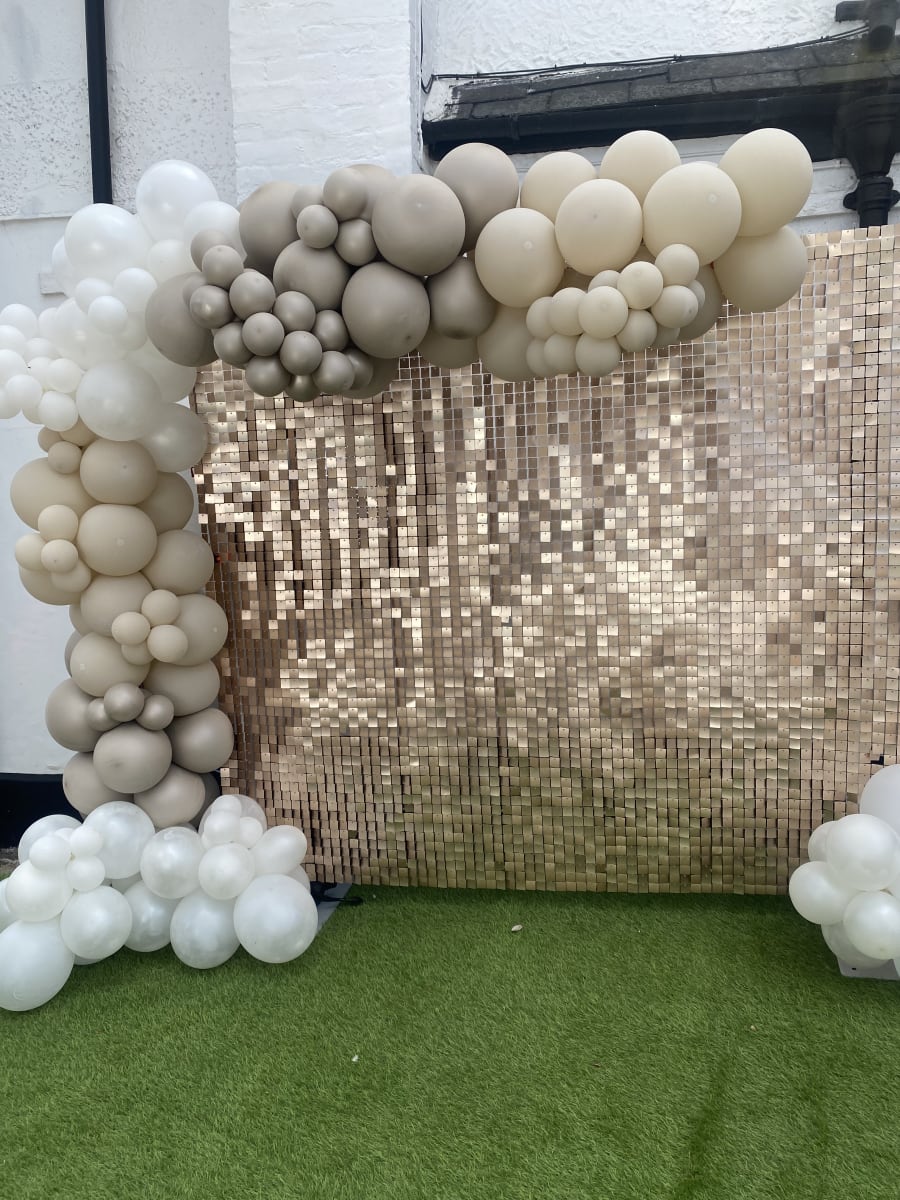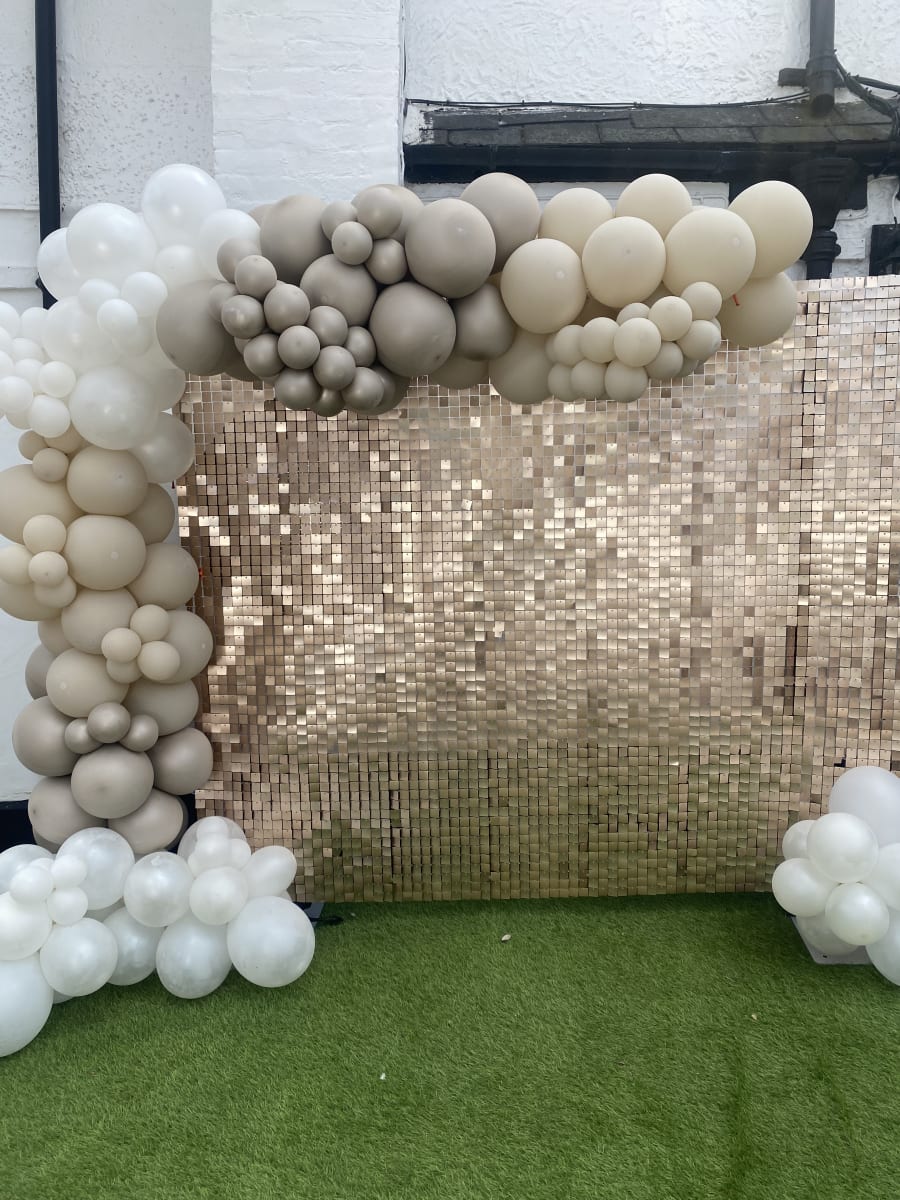 You may hire out the beige shimmer wall on its own or go with a beautiful balloon and shimmer combo.
